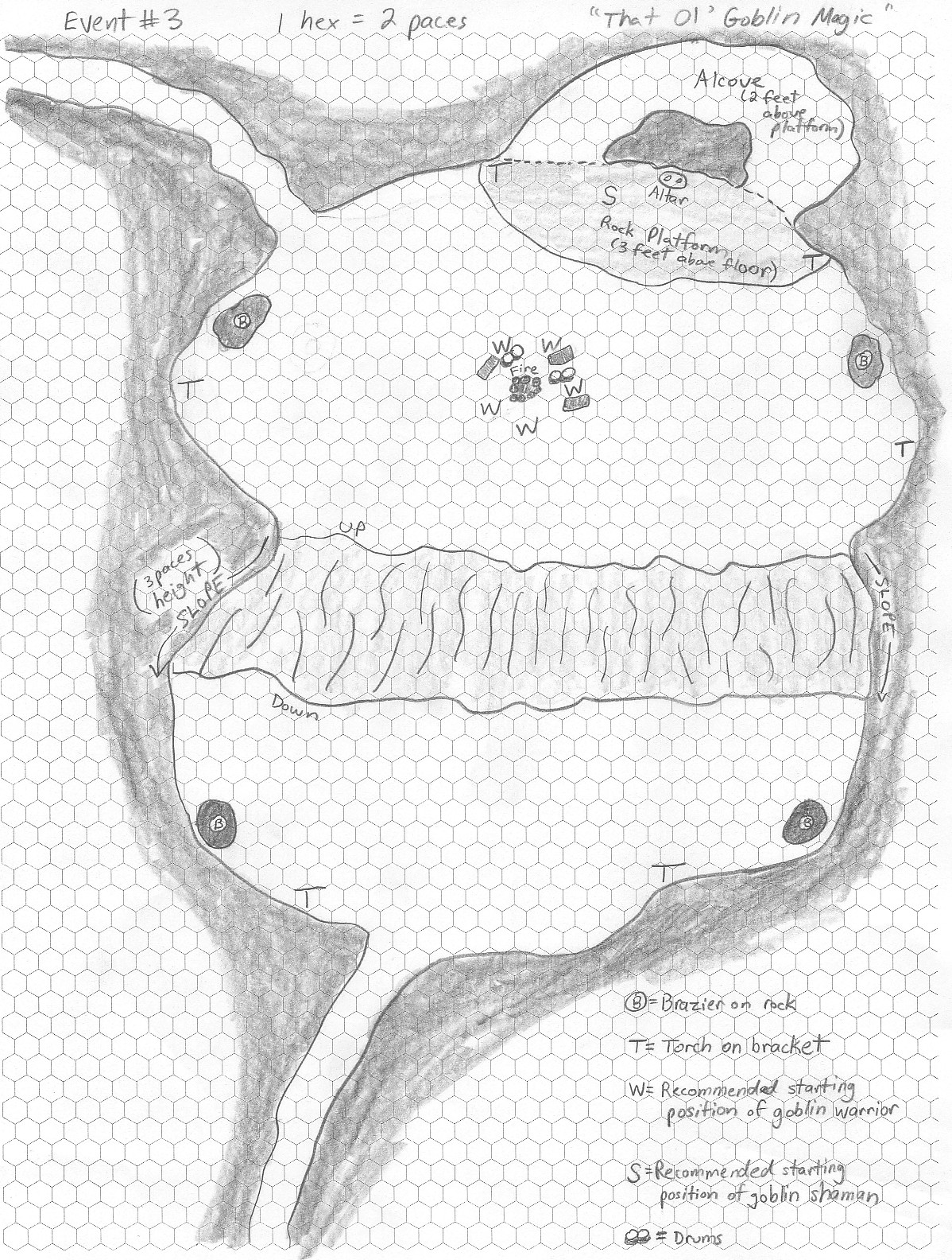 The slope cuts across the entire cave between where the heroes enter and where the foes are. The slopes grade is about 30%. The goblin warriors will try to fight the heroes on this slope, attempting to keep the high ground. Failing this, some may move toward the altar, to get another high ground. (Thus, the runner may make use of the various terrain levels.)