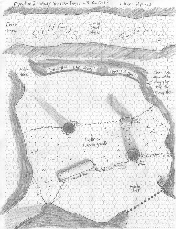 The heroes squish and slip their way down the green, fungus-filled tunnel. Up ahead, they hear a creepy, clattering sound. Far down the tunnel, they see several small land crabs. The crabs appear to be feeding on the fungus, and haven’t seen the heroes yet.
